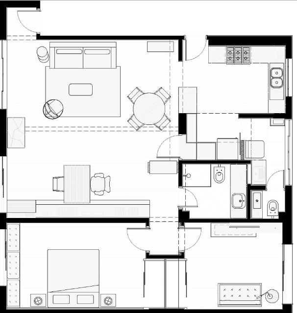 El pequeño departamento tiene una zona social amplia y flexible para ser utilizada según la disposición de los ocupantes; comprende una sala, pequeño estudio, cocina y cuarto de baño para visitas; los ambientes ventilan e iluminan por grandes ventanas generando confort para el usuario.
