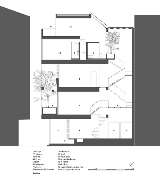 En el quinto nivel se ubica 13. área de oración, 14. azotea y 10. vacíos permitiendo el ingreso del aire.