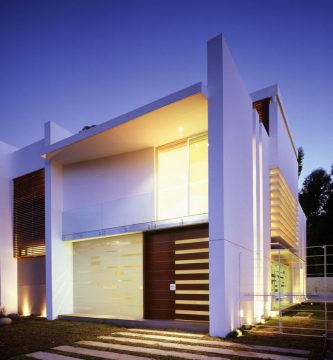 Diseño de moderna casa de dos pisos, imponente fachada y uso de patio central para iluminar y ventilar