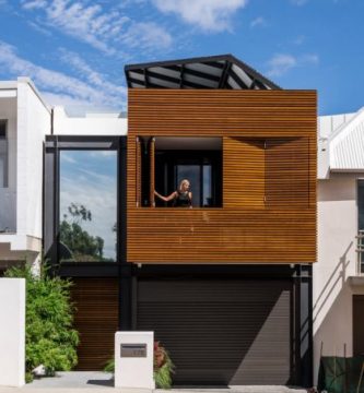 Diseño de casa moderna de dos pisos con azotea, fachada revestida de madera y estructuras con acero